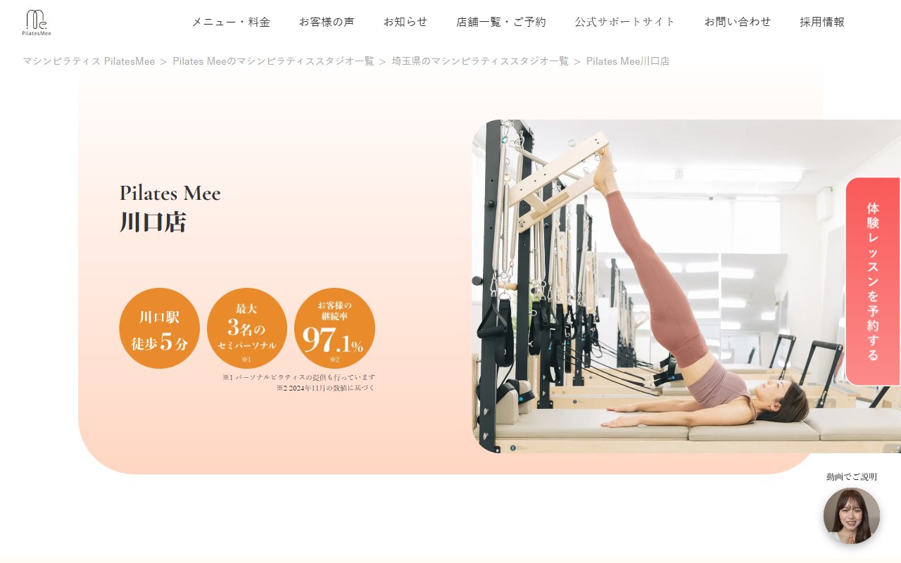 Pilates Mee 川口店は「全国チェーンの信頼感と、少人数制のきめ細かな指導が両立したマシンピラティススタジオ」です。