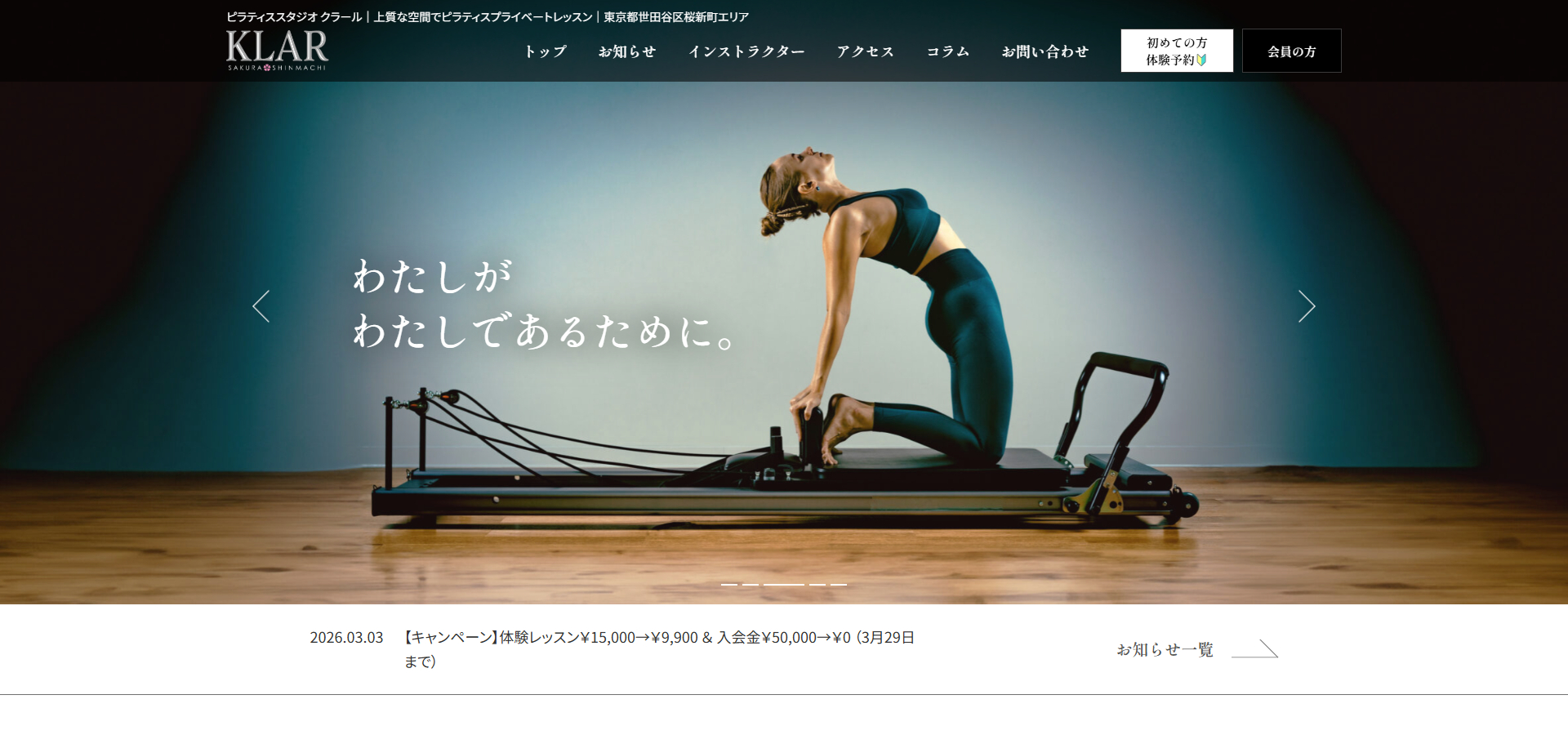 ピラティススタジオ KLARは、桜新町駅徒歩5分・完全プライベートレッスン専門で、AI姿勢分析とアメリカ認定資格インストラクターによる本格マシンピラティスを提供するプレミアムスタジオです。